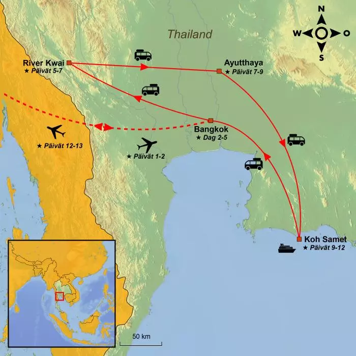 Koe Bangkokin häikäisevät kontrastit ja mahtava ruokakulttuuri, sukella historiaan Kwai-joen rannalla. Tutustu Ayutthayan vaikuttaviin temppeliraunioihin ja päätä matkasi ihanille Koh Sametin rannoille.