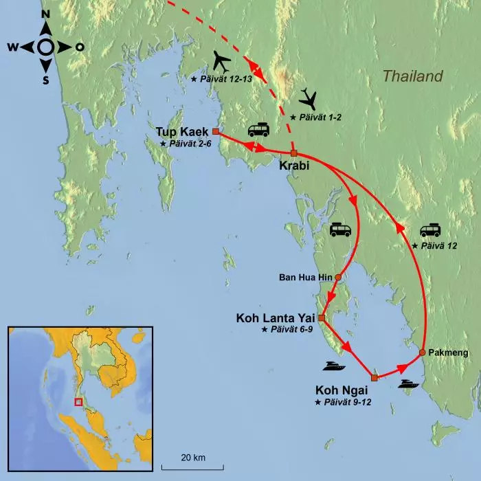 Matka alkaa Krabilta, missä voit majoittua joko Tup Kaekissa tai Ao Nangissa. Täällä on tiedossa rennon lomailun lisäksi jännittävä saarihyppely, joka vie sinut Andamaanienmeren kauneimmille ja mielenkiintoisimmille saarille ja Thaimaan hienoimmille hiekkarannoille, kuten Phra Nang Beachille.