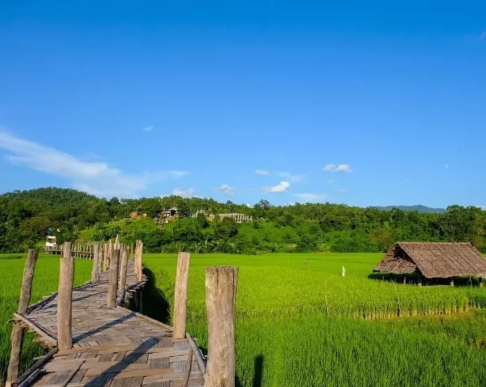 Kierros jatkuu ikoniselle Sutongpe-sillalle. Vaikuttava bambusilta ulottuu rehevien riisipeltojen poikki ja yhdistää kylän buddhalaiseen Wat Phu Sama -temppeliin. Sutongpe-silta on yksi Thaimaan pisimmistä bambusilloista, joka on noin 500 metriä pitkä. Paikalliset kyläläiset ja munkit rakensivat sen yhteistyön ja uskon symboliksi. Sillalla on edelleen rooli jokapäiväisessä elämässään, kun munkit ylittävät sen päivittäin almukierroksellaan.