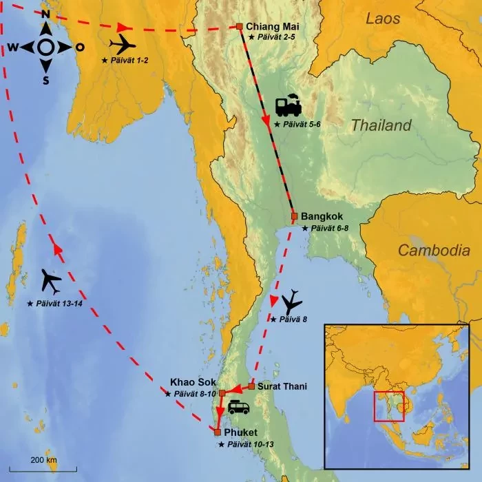 Kierrä Thaimaa pohjoisesta etelään ja koe viehättävä Chiang Mai, vilkas Bangkok ja vehreä Khao Sokin kansallispuisto. Rentoudu lopuksi Phuketin hienoilla hiekkarannoilla.