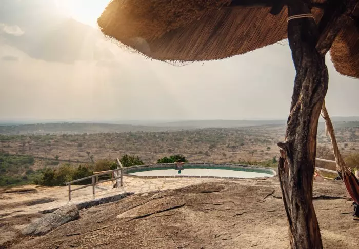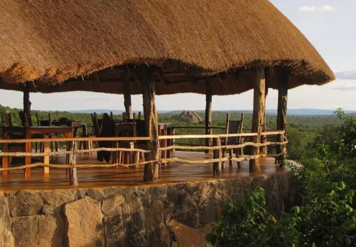 Ravintolasta avautuva näköala on henkeäsalpaavan kaunis. Lähellä oleva juomapaikka houkuttelee auringonlaskun aikaan janoisia eläimiä, joten illallisella istuessa voi usein päästä ihailemaan seeproja ja impaloja.