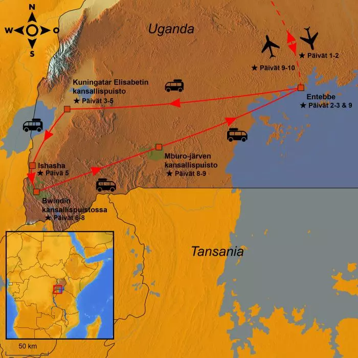 | Päivä 6 | Ishasha – Bwindi | 55 |