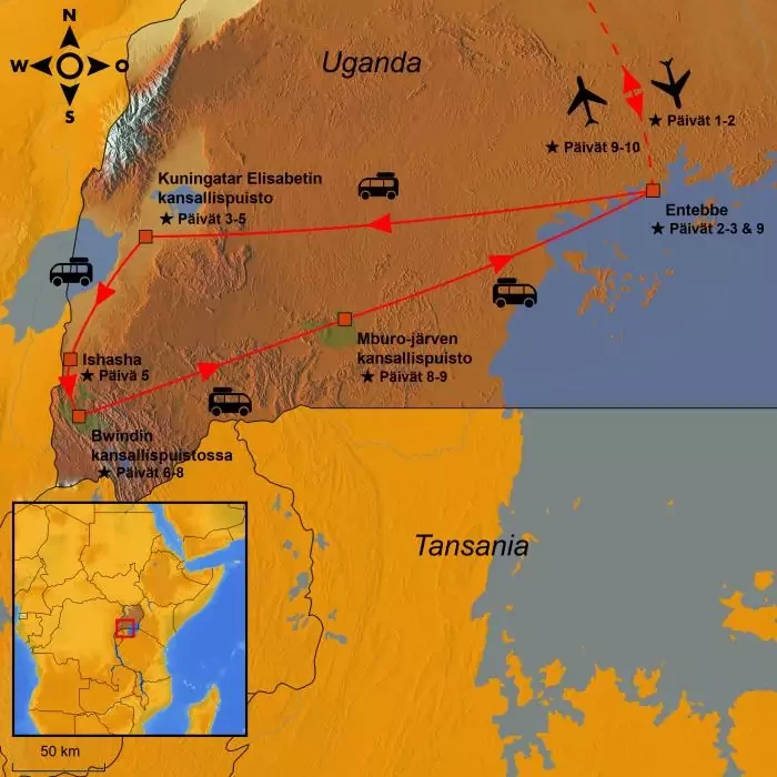 Tämä matka näyttää sinulle Ugandan parhaat puolet: Victoriajärven, joka on maailman toiseksi suurin makean veden järvi, päiväntasaajan, Kuningatar Elisabetin kansallispuiston, Bwindin kansallispuiston ja Mburo-järven. Täällä voit kohdata monia Afrikan legendaarisia eläimiä, kuten norsuja, leijonia, leopardeja, virtahepoja, krokotiilejä, puhveleita sekä simpansseja ja gorilloja vehreiden sademetsien syvyyksissä.