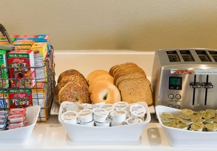 Yhteisessä oleskelutilassa voit aloittaa päiväsi kupillisella kahvia ja kevyellä mannermaisella aamiaisella.