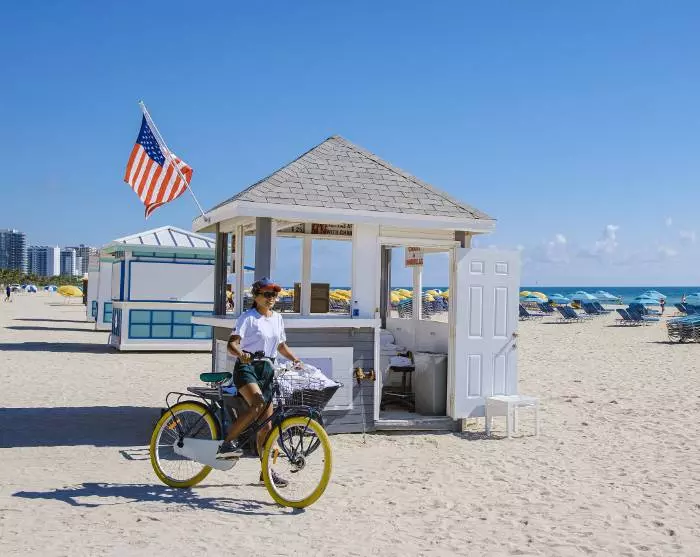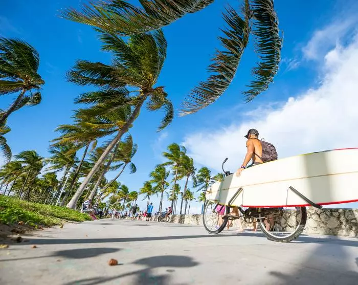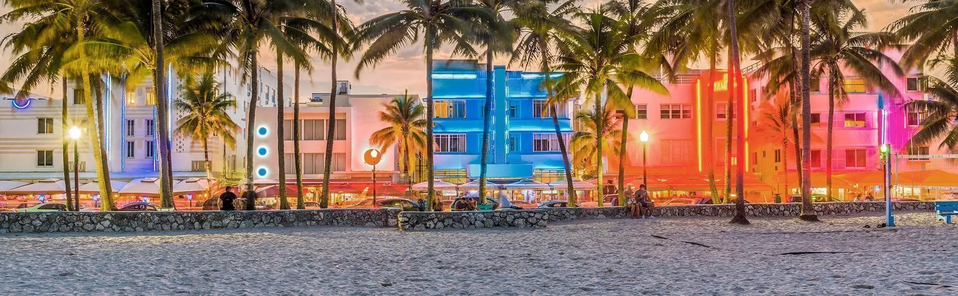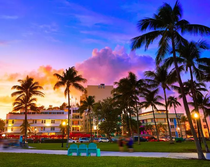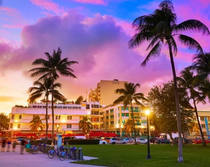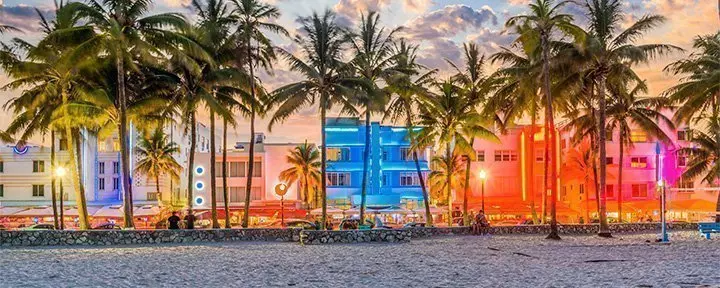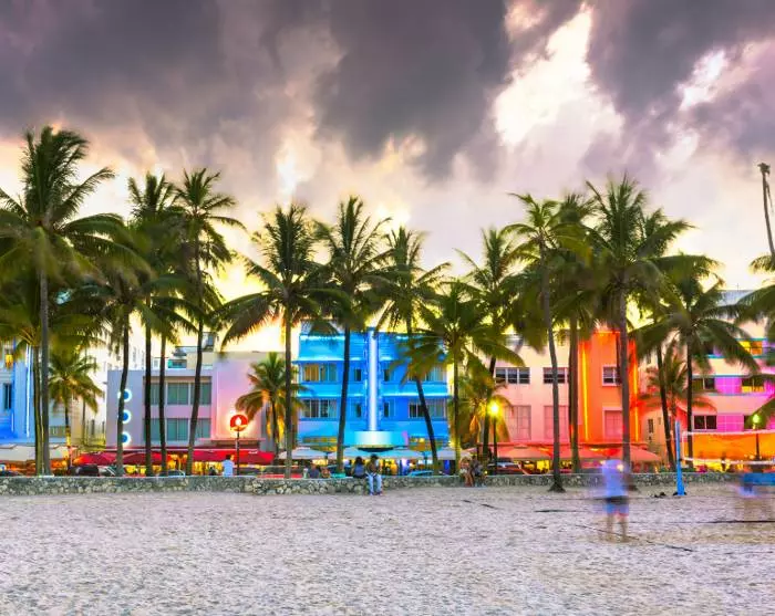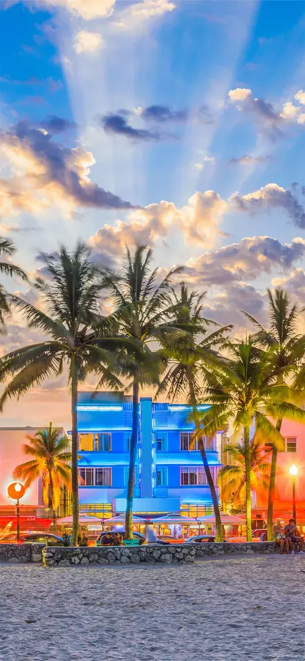 Tiedät heti, että lähestyt Miamia, kun kaupunkimaisema ja sen suuret rakennukset, suuret autot ja risteilyalukset alkavat korvata laajat näkymät merelle. Yövyt Miami Beachillä, joka tunnetaan kirkkaanvärisistä art deco -taloistaan, rannastaan ja kuuluisan Collins Avenue kaupoistaan.
