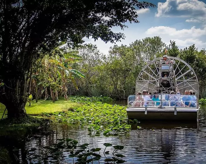 Evergladesin kansallispuistossa tunnet jännitystä, kun melkein leijut veden päällä ikonisissa airboat-veneissä edetessäsi yhdessä oppaasi ja muiden matkustajien kanssa. Noin 30 minuutin opastettu kierros antaa näkemyksen ekosysteemin kasvistosta ja eläimistä yli 6 000 km2:n kansallispuistossa. Puistossa on alligaattoreita, krokotiileja, mustakarhuja, sammakkoja, käärmeitä ja yli 360 lintulajia.