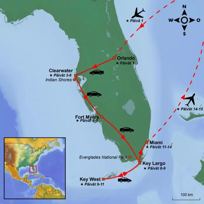 Tänään lähdet automatkasi viimeiselle osuudelle, ja matka takaisin mantereelle on yhtä kaunis myös pohjoiseen päin ajettaessa. Jos matkalla oli joitakin pieniä kiertoteitä, joille et päässyt tullessasi Key Westiin, sinulla on nyt mahdollisuus vierailla paikoissa, jotka jäivät väliin ennen Miamiin saapumistasi.