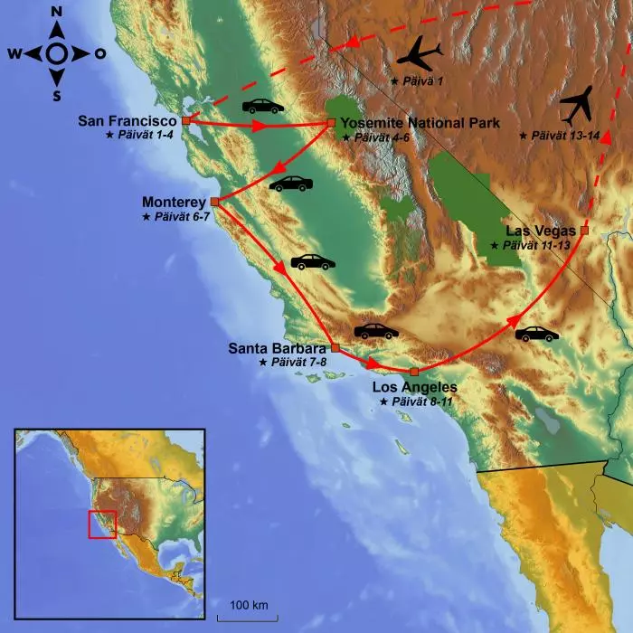 Unelmoitko melko lyhyestä autolomaseikkailusta Länsi-Yhdysvalloissa, jossa näet matkan varrella monia kuuluisia nähtävyyksiä? Haluaisitko tuntea Yhdysvaltojen rannikkokaupunkien ja aavikon välisen kontrastin? Jos näin on, tämä Kalifornian San Franciscosta Nevadan Las Vegasiin yltävä kierros on oikea valinta sinulle.