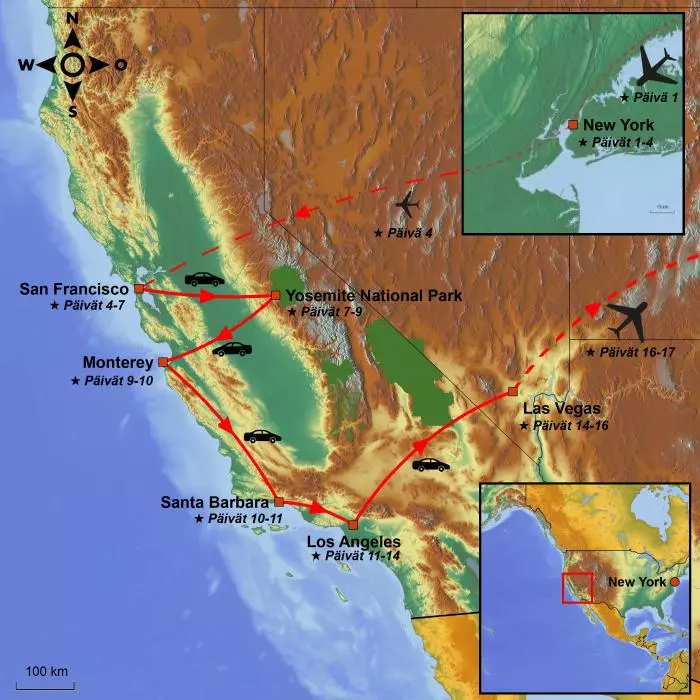 Koe Kalifornian upeimmat kaupungit ja luontokohteet pohjoisesta etelään: San Francisco, Yosemite, Highway 1, Los Angeles ja lopuksi rantakaupunki San Diego.