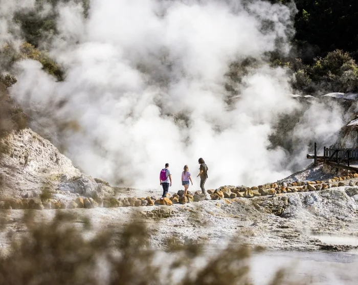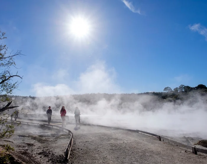 Perille päästyäsi voit lähteä puistoon itseopastetulle kävelykierrokselle, joka kestää noin 1–1,5 tuntia. Täällä sinua odottavat höyryävät rikkilähteet, kuplivat mutalammet ja kuumat vesiputoukset – ja kaikkea ympäröivä rikin tuoksu, lämmin usva ja kiteytyneet mineraalikerrostumat. Reitti on helppokulkuinen ja selkeästi merkitty. Matkan varrella on näköalapaikkoja ja opastauluja, jotka kertovat alueen ainutlaatuisesta geologiasta ja merkityksestä maoreille.