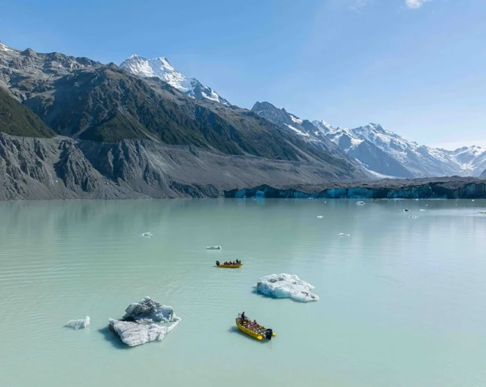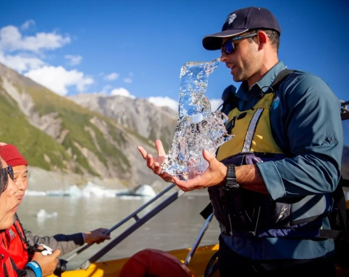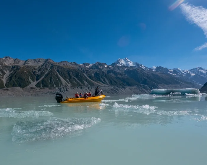 Saavuttuasi Tasmanjärvelle saat pelastusliivin ja nouset erityisvalmisteiseen moottoroituun ponttooniveneeseen, jolla on helppo navigoida järvellä. Järvellä sinua ympäröivät kaiken muotoiset ja kokoiset kelluvat jäävuoret – ja järven toisessa päässä siintää mahtava jäätikkö. Hyvällä onnella voit päästä todistamaan jäätikön ”vasikointia” eli jäälohkareen irtoamista ja putoamista veteen. Kyseessä on paitsi näyttävä näky myös surullinen muistutus Tasmanin jäätikön nopeasti etenevästä sulamisesta ilmaston lämpenemisen vuoksi.