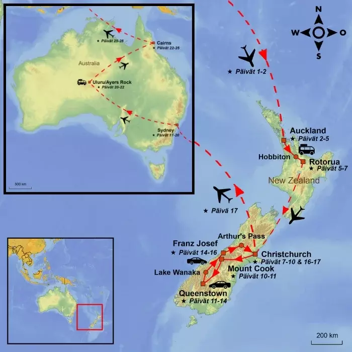 Seikkailu alkaa Uudesta-Seelannista, jossa pääset tutustumaan maorikulttuuriin, geotermisiin ihmeisiin, vuoristojärviin ja jäätiköihin. Matka jatkuu Australiassa Sydneyn, Ulurun punaiseen aavikkoon ja päättyy trooppiseen Cairnsiin.