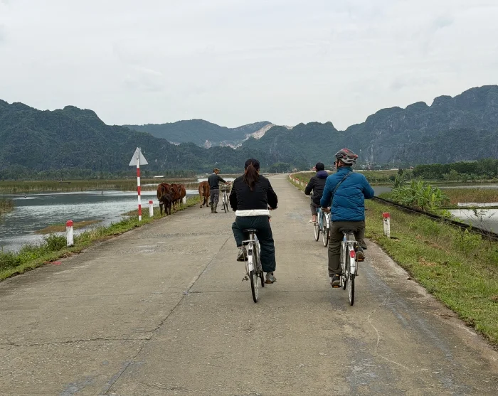 Tämän jälkeen pyöräilet takaisin lähtöpaikkaan, matka kestää vain muutaman minuutin. Palautat pyörän ja sinut kuljetetaan Van Longiin. Siellä nouset perinteiseen soutuveneeseen. Vene lipuu rauhallisesti hiljaisen luonnonsuojelualueen lävitse. Täällä koet rauhallisia kosteikkoja, näyttäviä kalkkikivikallioita ja runsaan linnuston, jotka luovat tunnelmallisen maiseman. Kalkkikivivuoret kohoavat dramaattisesti veden yläpuolelle, samalla kun rehevä kasvillisuus heijastuu tyyneen vedenpintaan.