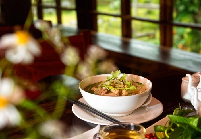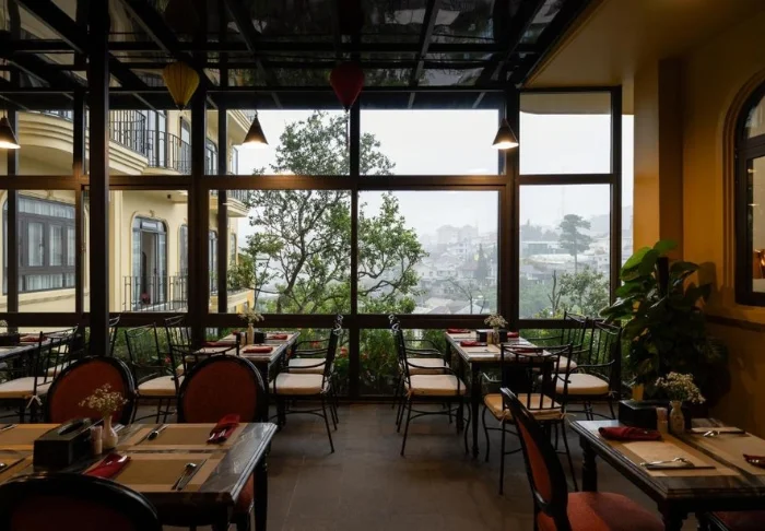 Hotellin ravintolan ruokalistalla on herkullisia vietnamilaisia ruokia ja kansainvälisiä suosikkeja.