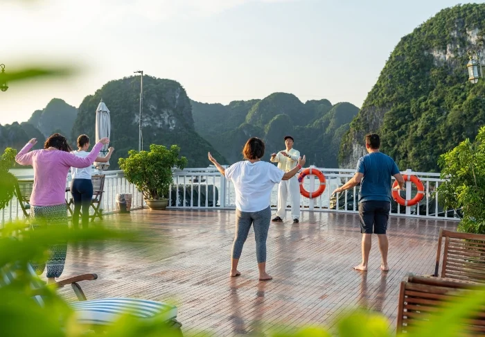 Kun astut ulos hytistä, voit nauttia aurinkokannesta, jolta löytyy aurinkotuoleja ja upea panoraamanäkymä lahden kivimuodostelmille. Voit myös rentoutua spa-alueella. Laivalla järjestetään lisäksi aktiviteetteja, kuten kokkauskursseja, kajakkiretkiä ja Taiji-harjoituksia – voit siis yhdistää elämykset ja rentoutumisen täydellisesti.