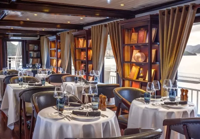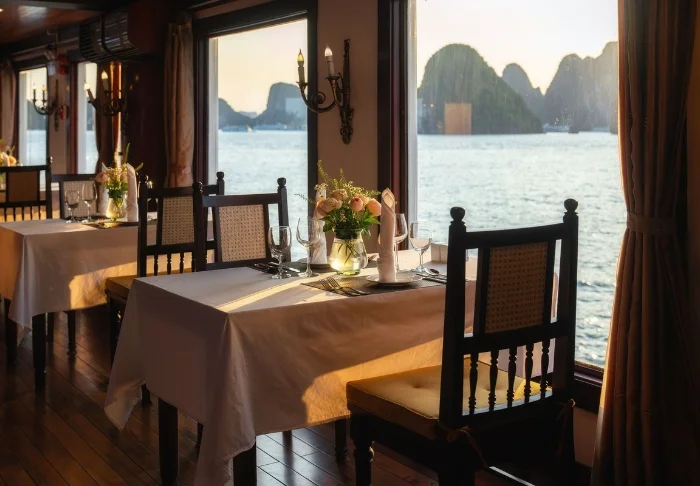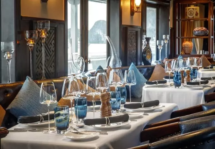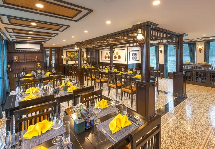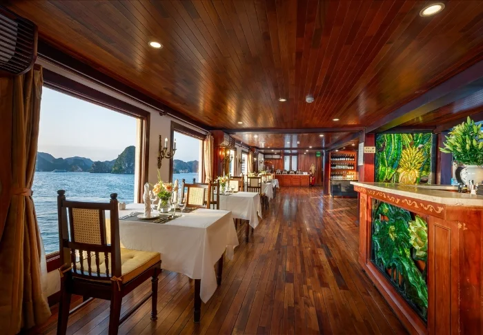 Laivan ravintolassa tarjoillaan paikallisista raaka-aineista valmistettua, eksoottisesti maustettua vietnamilaista ruokaa. Ravintolan viihtyisä puusisustus luo romanttista tunnelmaa.