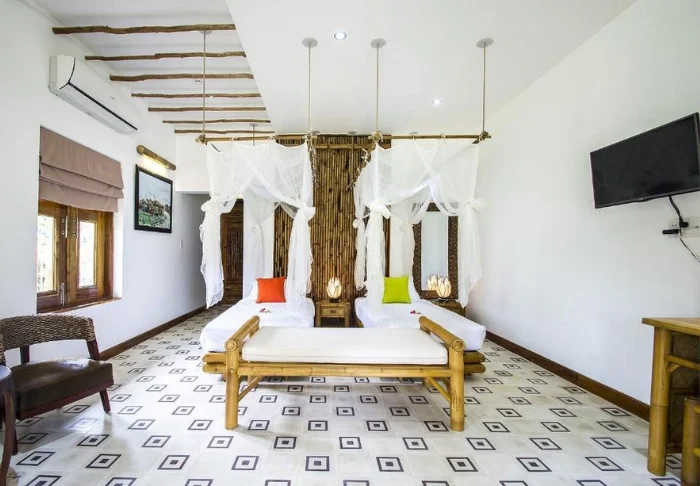 Resortissa on kauniita, tilavia huoneita ja bungaloweja vehreiden, maisemoitujen puutarhojen keskellä, ja sieltä on helppo päästä uima-altaalle ja rannalle johtaville poluille. Kaikki huoneet ja bungalowit on sisustettu kirkkain värein ja kauniilla puukalusteilla. Jokaisessa yksikössä on ilmastointi, WiFi, minibaari, tallelokero, TV ja vedenkeitin, joten voit valmistaa itsellesi kupillisen kahvia tai teetä omalla terassillasi. Kylpyhuoneessa on suihku, ja vieraiden käytössä ovat myös hygieniatarvikkeet, hiustenkuivaaja, kylpytakki ja tohvelit.