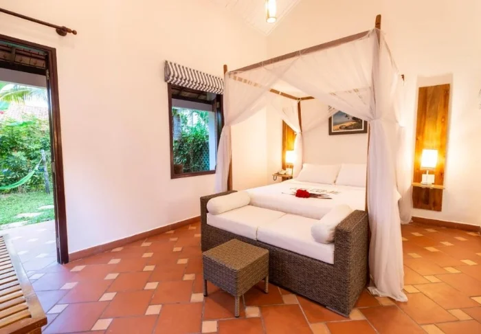 Majoitut lähtökohtaisesti Garden View Bungalowissa. Huone on sisustettu yksinkertaisesti, mutta tarjoaa kaiken tarvittavan mukavaan oleskeluun. Sänkynä on joko parivuode tai kaksi erillistä vuodetta hyttysverkolla. Huoneesta löytyy ilmastointi, minibaari, WiFi, tallelokero sekä kylpyhuone suihkulla ja kylpytuotteilla. Yksityiseltä terassilta avautuu näkymä vehreään maisemaan, joten luonto on aina lähellä.
