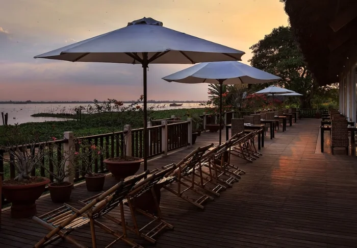 Päivän päätteeksi voi nauttia virkistävän juoman baarissa ja ihailla auringonlaskua Mekongin yllä.