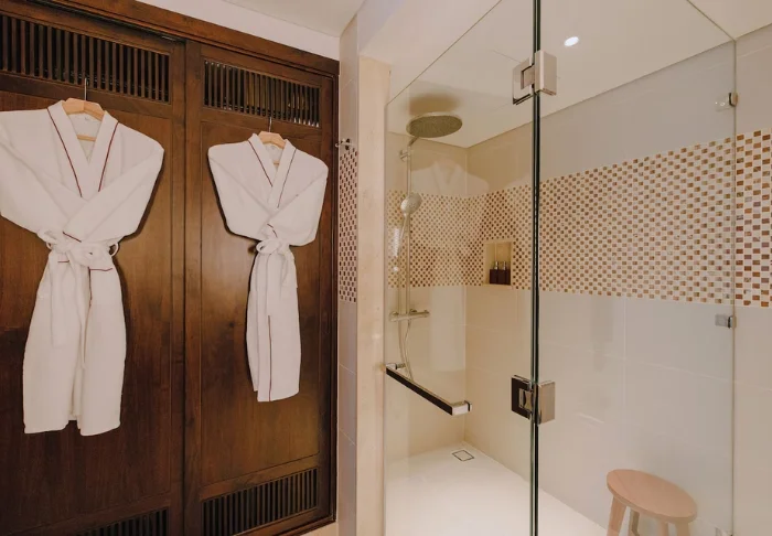 Huoneet on sisustettu tyylikkäästi luonnollisilla väreillä, joita piristävät upeat kontrastivärit mm. tyynyissä ja peitteissä. Kylpyhuoneen katto on osittain avonainen, joten voit tuntea mukavan tuulenvireen ja aistia meren tuoksun. Kaikissa huoneissa on ilmastointi, minibaari, teen- ja kahvinkeittotarvikkeet, tallelokero, WiFi, taulutelevisio, hyttysverkko ja oma terassi.