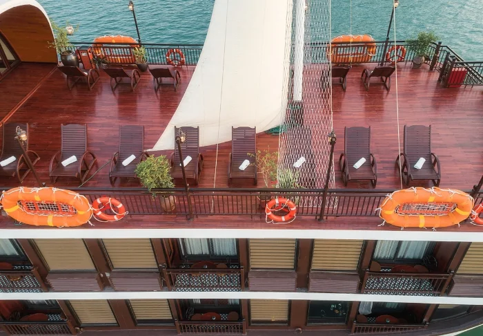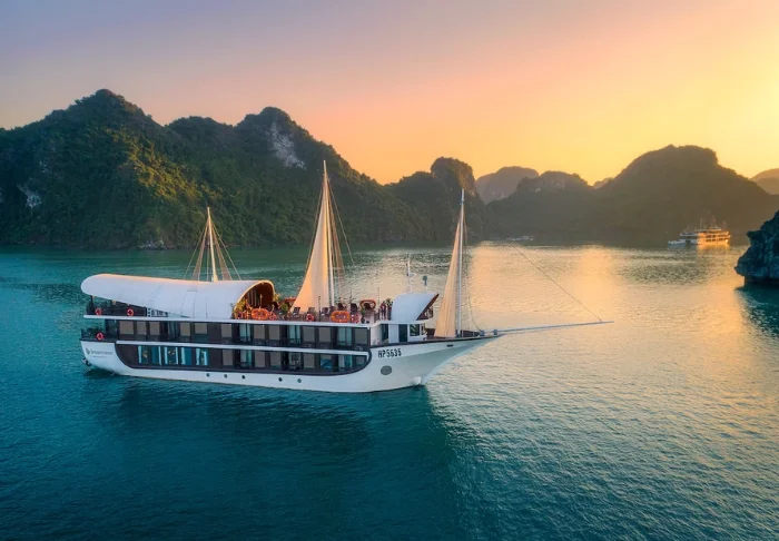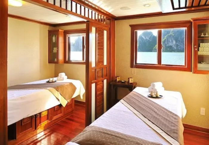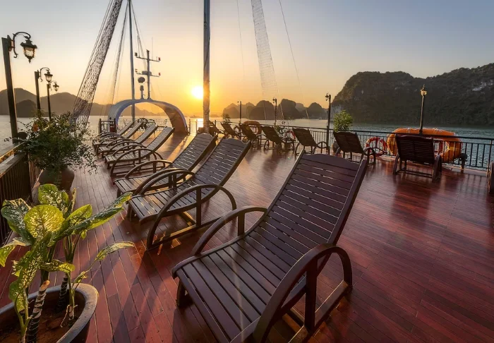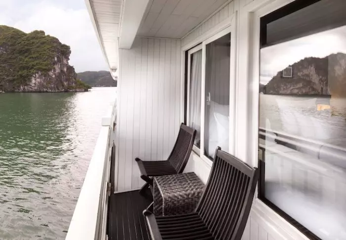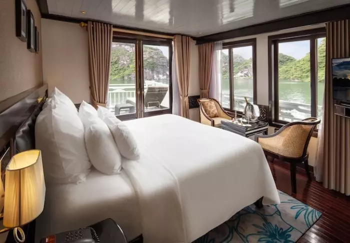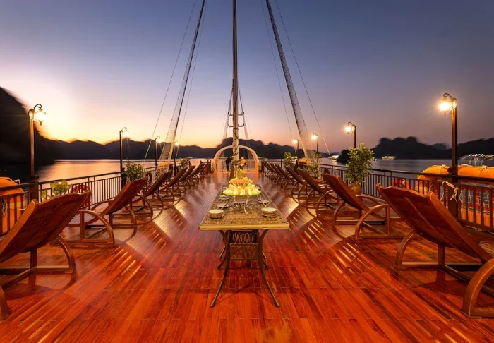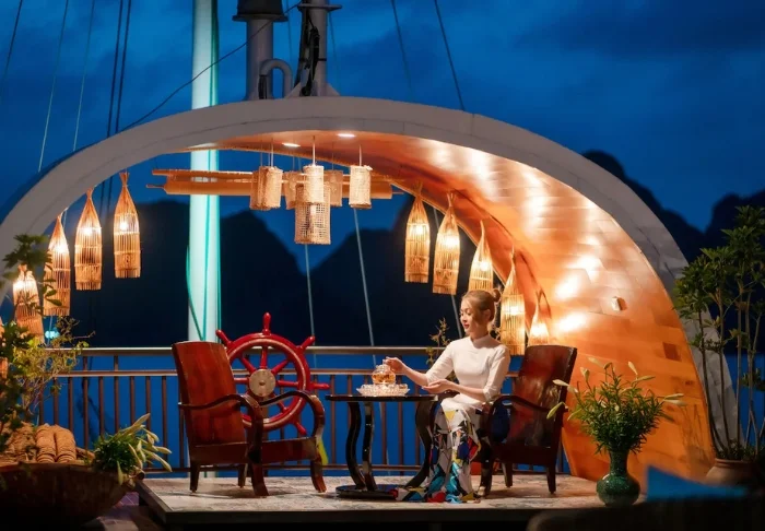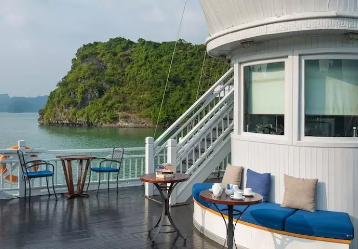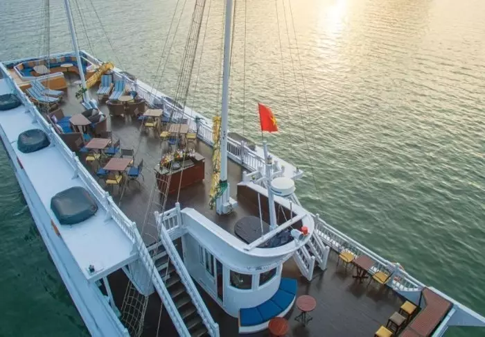 Laivalla on aurinkokansi sekä ravintola, jossa tarjoillaan vastapyydettyjä mereneläviä ja vietnamilaisia klassikkoannoksia veneen lipuessa huikeiden maisemien halki. Päivisin laiva pysähtyy autioille saarille ja pieniin kalastajakyliin. Voit lähteä kajakkiretkelle, tutustua luoliin tai pulahtaa uimaan suoraan laivan perästä. Iltaisin vallitsee hiljaisuus ja rauha kirkkaan tähtitaivaan alla, ja kannella voit nauttia virkistävästä juomasta.