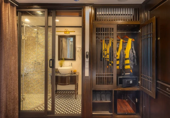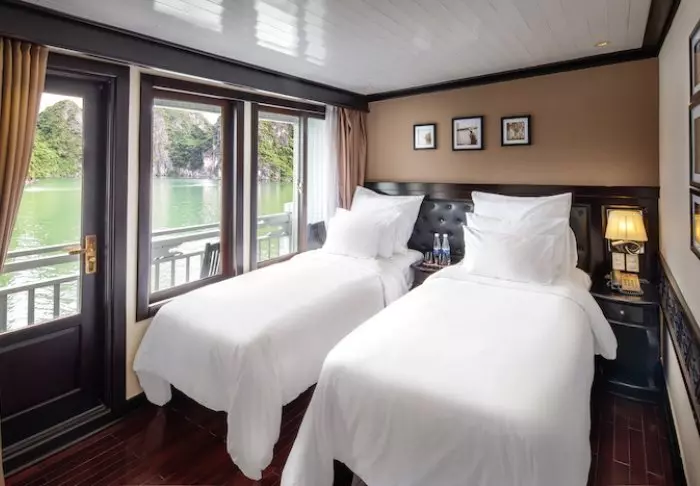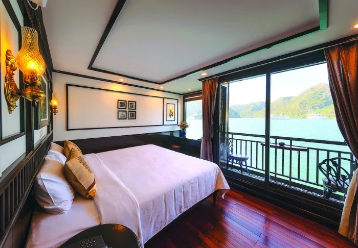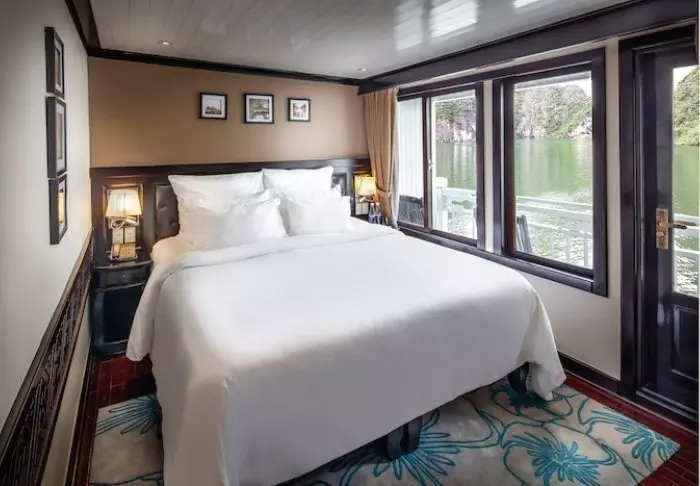 Laivalla on 18 hyttiä, ja majoitut lähtökohtaisesti deluxe-luokan hytissä, jonka suurista ikkunoista avautuu näkymä suoraan lahdelle. Aamulla voit herätä lempeään aaltojen loiskeeseen ja aurinkoon, joka kohoaa lahden ylle. Hytit on sisustettu lämpimillä puumateriaaleilla, pehmeillä verhoilla, tummilla puuhuonekaluilla ja klassisilla vietnamilaisilla yksityiskohdilla. Vuoteena on parivuode tai kaksi erillistä vuodetta, ja alle 12‑vuotiaalle lapselle voidaan järjestää lisävuode. Hytissä on ilmastointi, minibaari, vedenkeitin teen ja kahvin valmistusvälineet sekä oma kylpyhuone suihkulla ja kylpytuotteilla. Tunnelma on kodikas ja lämminhenkinen, ja kaikki tarvittava löytyy – ja kun näkymät ovat näin upeat, muuta ei juuri kaipaakaan.
