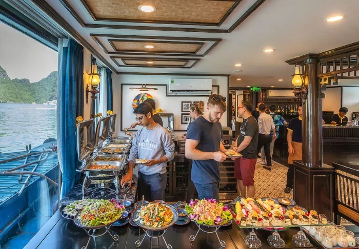 Aluksella on ravintola, jossa tarjoillaan sekä vietnamilaisia erikoisuuksia että kansainvälisiä annoksia. Ateriat nautitaan rennossa ympäristössä, ja ravintolasta tulee nopeasti luonteva kohtaamispaikka päivän elämysten sulattelulle.