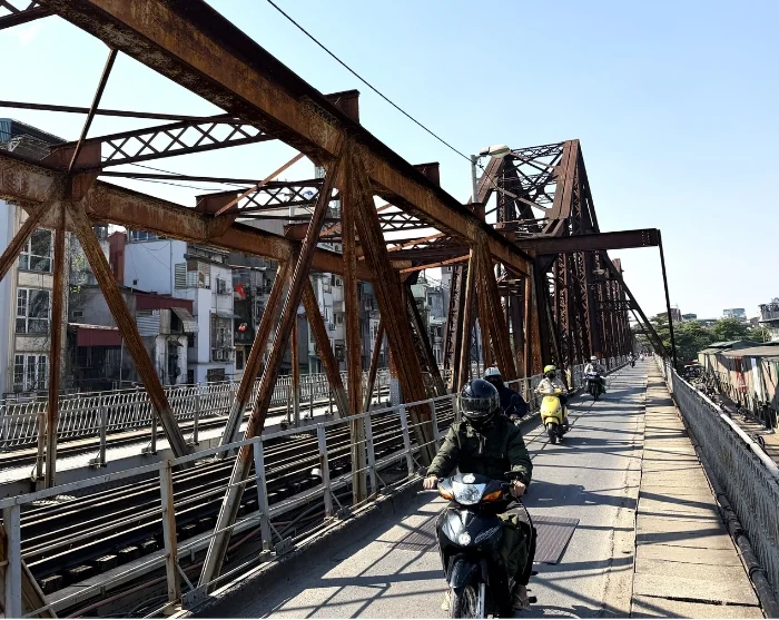 Jännittävän rikša -ajelun jälkeen vierailet historiallisella Long Bienin sillalla. Silta on ikoninen maamerkki Ranskan siirtomaa-ajalta ja se on rakennettu 1900-luvun alussa. Tunnusomainen rautasilta ylittää Punaisenjoen. Se vaurioitui pahoin Vietnamin sodassa, mutta on nykyään vahva symboli Hanoin sitkeydestä ja historiasta. Sillalla saat aidon katsauksen Hanoin arkipäivään: paikalliset ajavat skoottereilla töihin ja töistä, rinta rinnan pyöräilijöiden ja jalankulkijoiden kanssa. Kun katsot alas sillalta, näet vilkkaan Long Bienin torin, jossa on toimintaa varhaisesta aamusta lähtien. Joen rauhallinen näkymä muodostaa kauniin vastapainon kaupungin sykkeelle. Silta onkin suosittu kuvauspaikka valokuvaajille ja matkailijoille, jotka haluavat tallentaa Hanoin tunnelman.
