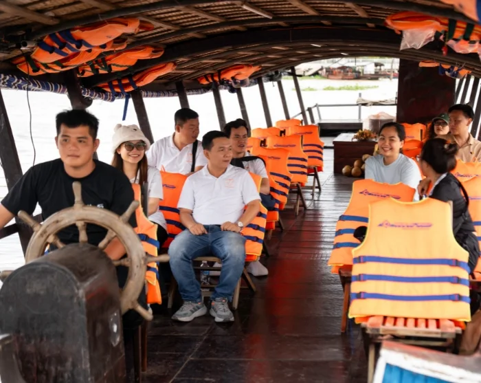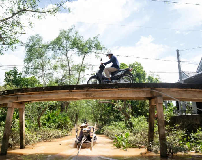 Noin 2,5 tunnin ajomatkan jälkeen saavut Cai Ben kaupunkiin. Täällä nouset veneeseen ja lähdet risteilylle vehreään Mekongin suistoon. Vierailet paikallisissa pajoissa, joissa taitavat käsityöläiset valmistavat erilaisia tuotteita kookoksesta. Tämän jälkeen jatkat matkaa pienellä sampan-veneellä – perinteisellä käsin soudettavalla puuveneellä – Mekongin suiston kapeiden, mutkittelevien kanavien halki.