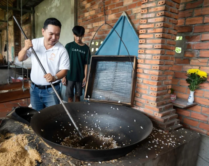 Veneajelu vie sinut rauhalliselle saarelle keskelle Mekong-jokea, missä nautit vietnamilaisen lounaan, joka on valmistettu tuoreista paikallisista raaka-aineista.