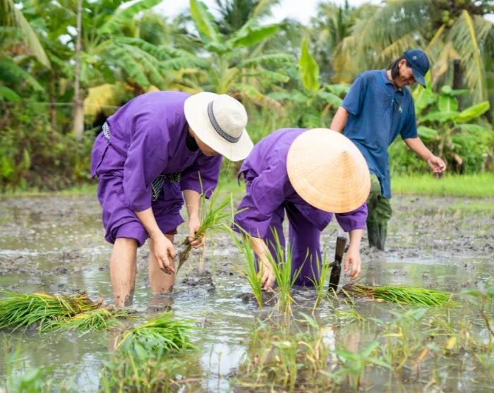 Jatkat matkaa Vinh Longiin, jossa tutustut sosiaaliseen kestävän kehityksen hankkeeseemme, jonka paikallinen yhteistyökumppanimme on käynnistänyt. Siellä sinua odottaa rauhallinen kävely kylän halki, ja oppaasi kertoo matkan varrella projektista. Saat myös mahdollisuuden osallistua perinteiseen maataloustyöhön. Paikallisten viljelijöiden kanssa pääset kokeilemaan riisinviljelyä – joko istuttamaan nuoria riisin taimia tai auttamaan sadonkorjuussa, vuodenajasta riippuen. Tämä on opettavainen ja maanläheinen kokemus, joka tarjoaa ainutlaatuisen näkymän Vietnamin maaseudun arkeen ja kestävän maatalouden taustalla olevaan työhön. Osallistumalla retkelle tuet samalla myös Vinh Longin perheitä, sillä osa matkan hinnasta menee suoraan hankkeelle, josta voit lukea lisää täällä.