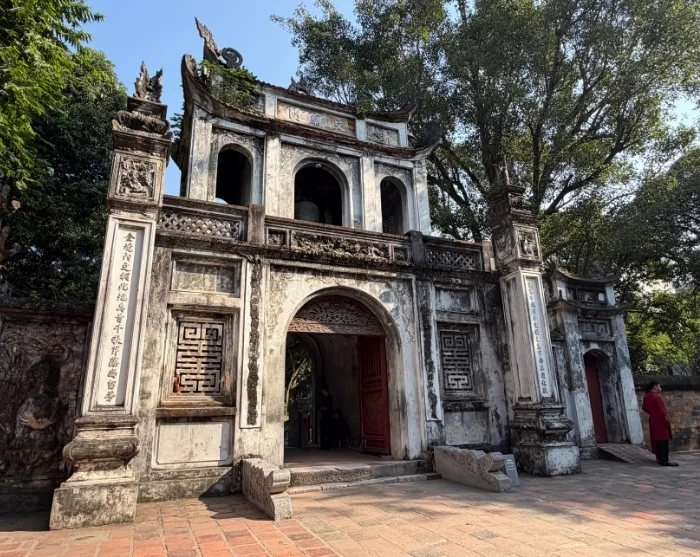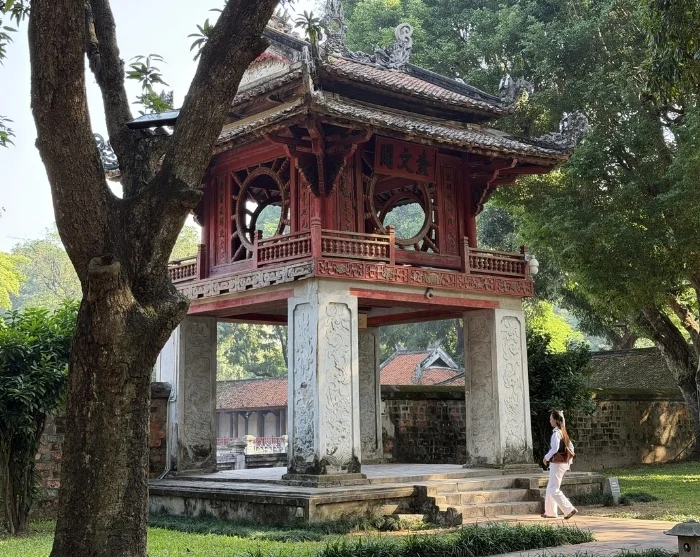 Tämän jälkeen sinut kuljetetaan Kirjallisuuden temppeliin, rauhalliseen 1100-luvulla rakennettuun kompleksiin, jonka perustivat kiinalaisen filosofin Konfutsen oppilaat. Lähes tuhatvuotinen temppeli on harvinainen ja hyvin säilynyt esimerkki perinteisestä vietnamilaisesta arkkitehtuurista. Siellä on pylväskäytäviä, lampia ja vihreitä sisäpihoja, jonne nuoret opiskelijat tulevat yhä tänä päivänä rukoilemaan onnea kokeisiinsa.