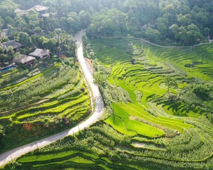 Tämän jälkeen nautit maukkaan paikallisen lounaan ennen kuin lähdet noin 3,5 kilometrin mittaiselle vaellukselle ympäröivien kylien läpi. Polut kiemurtelevat rehevien riisiterassien, bambumetsien ja pienten vesiputousten ohi, ja matkan varrella kuljet perinteisten paalutalojen lomitse. Reitti on pääosin tasainen ja helppokulkuinen, vain muutamassa kohdassa on lyhyitä nousuja ja laskuja.