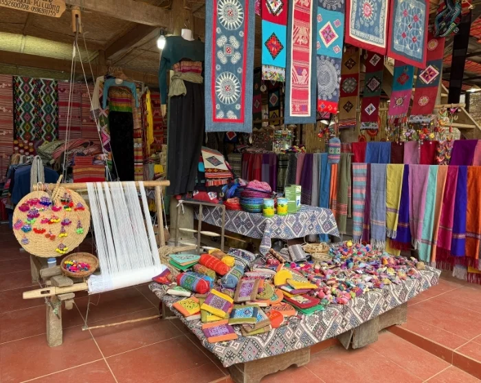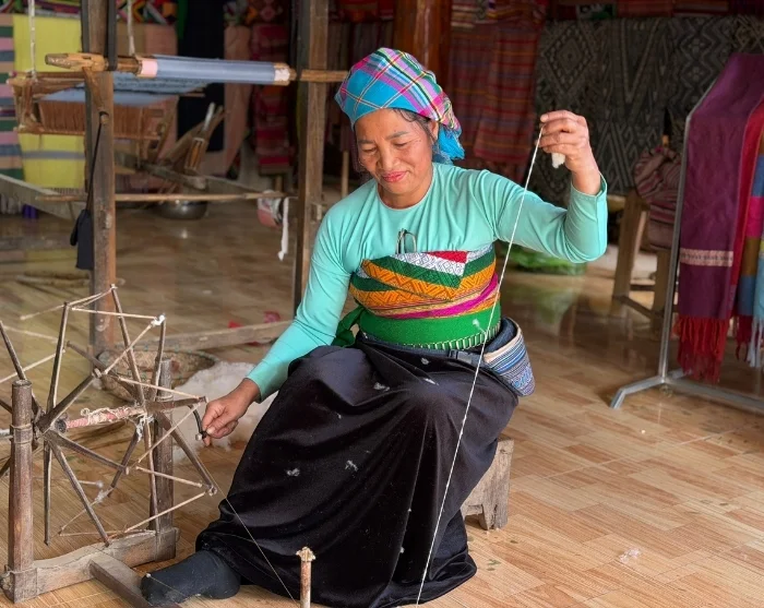 Oppaasi noutaa sinut majoituspaikastasi yhdessä paikallisen oppaan kanssa, joka tuntee polut, kylät ja niiden tarinat. Päivä alkaa vierailulla paikallisessa tekstiilityöpajassa. Siellä tapaat taitavia thai-kansan naisia, jotka ylläpitävät alueen satoja vuosia vanhaa kutomaperinnettä. Saat nähdä perinteisiä tekniikoita ja seurata, kuinka kuviot ja värit muotoutuvat hitaasti käsikäyttöisillä kangaspuilla luonnonvärejä käyttäen. Pääset myös itse kokeilemaan käsityötä ja huomaamaan, kuinka paljon työtä, tarkkuutta ja kärsivällisyyttä se vaatii. Työpajassa on lisäksi mahdollisuus ostaa paikallisia käsintehtyjä laukkuja, kukkaroita, mattoja, lyhtyjä ja korvakoruja.