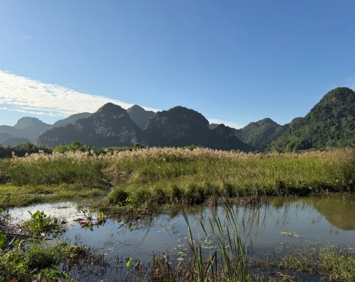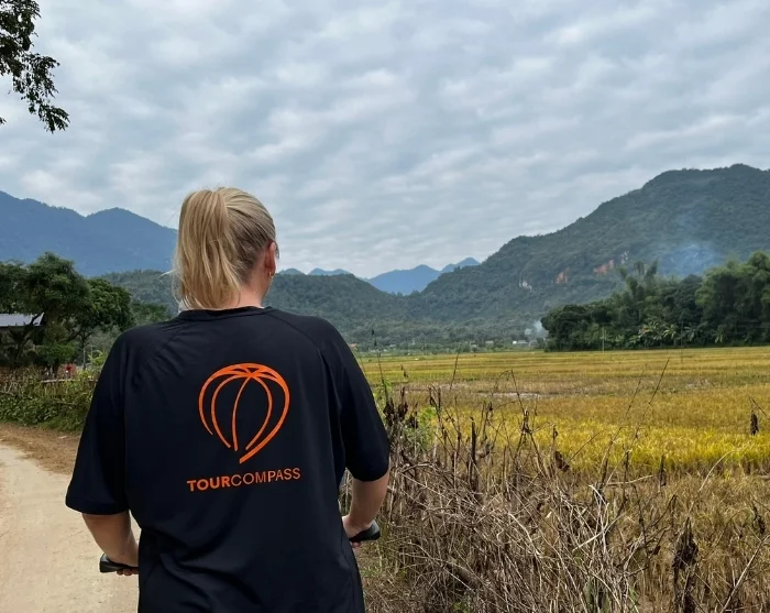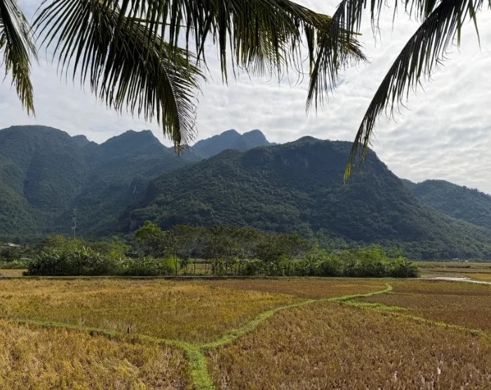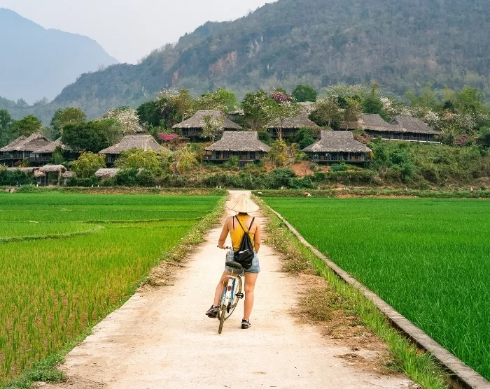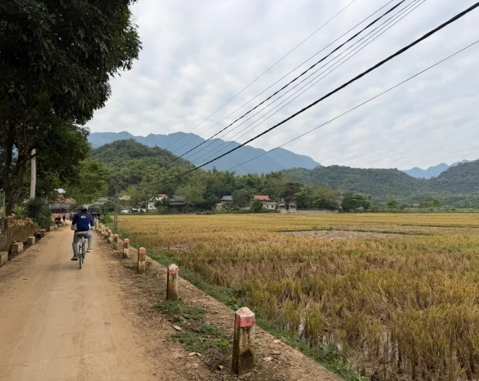 Hanoista matka jatkuu vehreään Mai Chaun laaksoon, jossa pyöräilet riisipeltojen ja kylien keskellä, ympärilläsi vihreät vuoret.