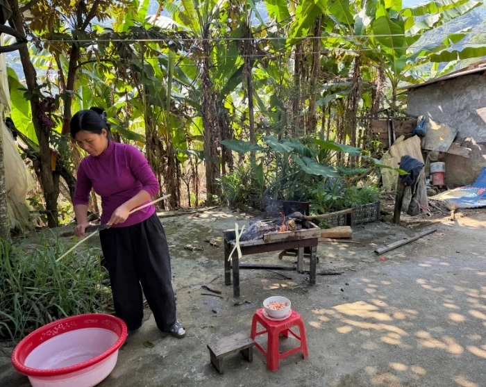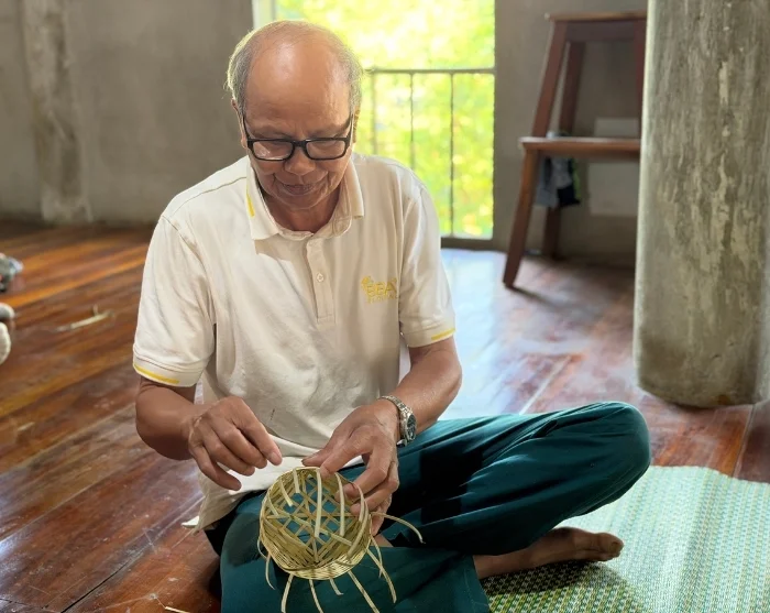 Seuraavaksi vierailet iäkkään pariskunnan luona ja saat katsauksen Muong-kansan vanhoihin käsityöperinteisiin: kudontaan ja bambupunontaan, joita on siirtynyt sukupolvelta toiselle. Luong-bambua käytetään muun muassa koreihin, kalapyytimeihin ja mattoihin. Jokainen kuvio ja tekniikka heijastaa osaa Muong-kansan kulttuuriperinnöstä, ja tuotteet toimivat sekä kestävänä vaihtoehtona moderneille materiaaleille että ainutlaatuisina matkamuistoina. Pääset myös itse kokeilemaan käsityötaitoja ja punomaan pienen korin, jonka voit ottaa mukaasi.