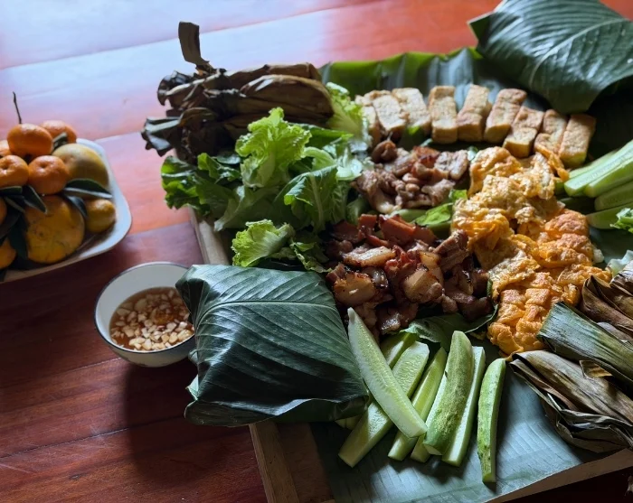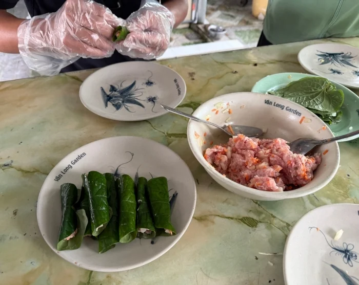 Veneretken jälkeen vierailet paikallisessa kylätalossa, jossa valmistelet isäntien kanssa perinteisiä annoksia. Lounas tarjoillaan kauniisti katetusta pöydästä paikallisten erikoisuuksien kera. Ruoka nautitaan yhdessä, mikä antaa aidon kuvan alueen ruokakulttuurista. Lisäksi on aikaa jutella isäntien kanssa ja oppia lisää muong-kansan arjesta, kulttuurista ja perinteistä.