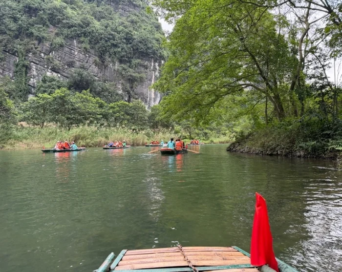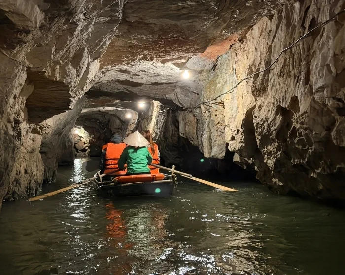 Tämän jälkeen poljet takaisin lähtöpaikkaan. Matka kestää vain muutaman minuutin. Palautat pyörän ja jatkat matkaa Trang Anin luolille, jotka muodostavat vaikuttavan luontoalueen dramaattisten kalliomuodostelmiensa ja kätkettyjen luoliensa ansiosta. Nouset perinteiseen sampan-veneeseen, joka kulkee hiljalleen rauhallista jokea pitkin luolien verkoston läpi, muun muassa Lam Caven, Vang Caven, Dai Caven ja Thanh Truot Caven kautta. Matkan varrella ohitetaan myös Cao Sonin, Suoi Tienin ja Vu Lamin temppelit sekä Skull Island, jota käytettiin vuoden 2017 elokuvan “Kong: Skull Island” kuvauspaikkana.
