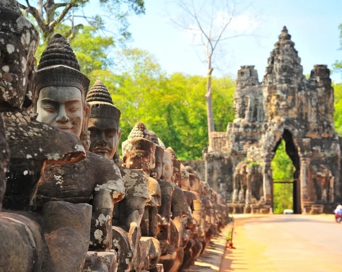 Päivä alkaa Angkor Thomin eteläportilta, jossa hyvien ja pahojen jumalten patsaat vartioivat sisäänkäyntiä. Seuraavaksi on vuorossa ikoninen Bayon-temppeli, joka tunnetaan sen korkeita torneja koristavista sadoista hymyilevistä kasvoista. Yksityiskohtaiset korkokuvat ovat erityisen vaikuttavia, ja ne esittävät sekä arkisia tapahtumia että khmerien ja muinaisten thaimaalaisten välisiä suuria taisteluja.