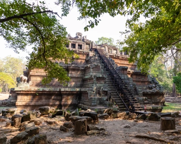 Näet Phimeanakasin, pyramidin muotoisen temppelin, jonka takana olevia lampia käytettiin aikoinaan uskonnollisiin rituaaleihin. Voit kiivetä temppelin huipulle ja nauttia upeasta näköalasta Angkorin alueelle.
