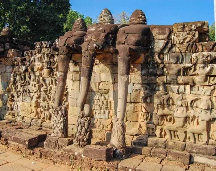 Tutustut myös Elefanttiterassiin, jossa pitkä rivi norsunpäitä esittäviä veistoksia muodostaa muurin. Täältä kuningas Jayavarman saattoi aikoinaan tarkastaa joukkonsa. Lähellä sijaitsee myös Leprakuninkaiden terassi, jossa on Yaman, hindumytologian kuoleman jumalan patsas.