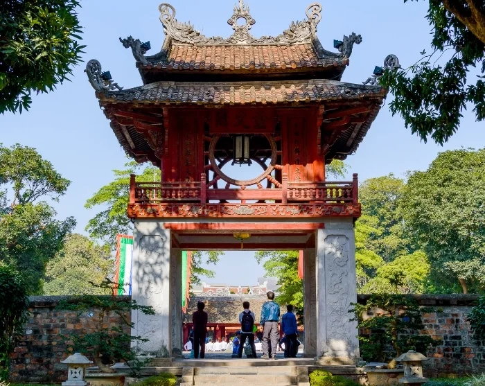 Seuraavaksi ajetaan katsomaan Kirjallisuuden temppeliä, rauhaisaa kompleksia, jonka rakensivat 1100-luvulla kiinalaisen filosofin Kungfutsen oppilaat. Lähes tuhatvuotias temppeli on harvinainen ja hyvin säilynyt esimerkki perinteisestä vietnamilaisesta arkkitehtuurista, johon kuuluvat pylväskäytävät, lammet ja vihreät sisäpihat. Nuoret opiskelijat tulevat tänne edelleen rukoilemaan onnea tentteihinsä.