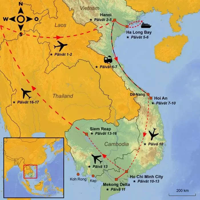 Koe Vietnam ja Kambodža yhdellä ja samalla matkalla, joka tarjoaa hyvän yhdistelmän retkiä ja vapaata aikaa.