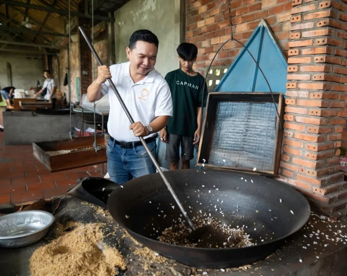Tuk-tuk kuljettaa sinut kylän rauhallisia teitä pitkin ja ensimmäinen pysähdys on paikallisen perheen luona, missä saat maistaa com depiä (vihreitä riisihiutaleita) ja näet, miten popriisiä valmistetaan.