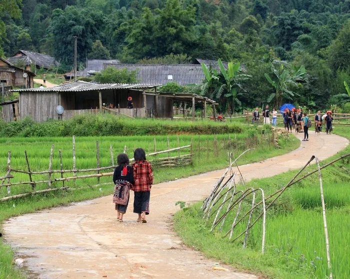 Sen jälkeen ajetaan pieneen kylään, joka sijaitsee kauniilla paikalla Muong Hoa -laaksossa. Ajomatka kestää noin tunnin. Täältä alkaa 1½–2 tuntia kestävä luonnonkaunis patikkaretki pitkin polkuja, jotka yhdistävät alueen pienet kyläyhteisöt toisiinsa. Reitti mutkittelee vihreiden vuorten rinteillä ja rehevien laaksojen läpi, ja selkeällä säällä voit nauttia näkymistä jylhälle Fansipan-vuorelle. Muista varautua patikkaretkeen mukavilla ja luistamattomilla kengillä, sillä polut saattavat muuttua märällä ilmalla liukkaiksi.