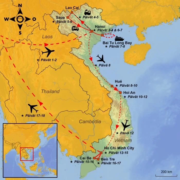 Koe seikkailullinen kiertomatka koko Vietnamin läpi vuoristoisesta Sapasta ja vilkkaasta pääkaupungista Hanoista keisarillisiin kaupunkeihin, viehättäviin rannikkokaupunkeihin, rehevään Mekongin suistoon ja sykkivään Ho Chi Minhin kaupunkiin.